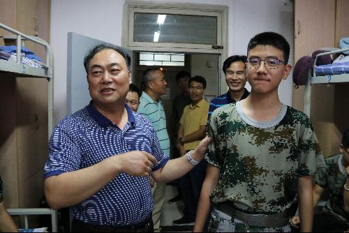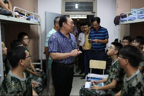 走访过程中,老师们详细了解同学们刚进校的状况和感受,认真察看住宿环境,不仅询问了新生来到学校饮食、住宿等生活问题,希望减轻同学们进入大学的不适感,也提到接下来的军训任务十分艰巨,虽然很辛苦,但也不失为一个锻炼身体、磨练意志的绝佳机会,这也将是自己在大学四年的生活中十分值得怀念的一段珍贵记忆。戴院长还着重强调同学们要注意人身财产安全,防止诈骗,遇到问题要及时联系老师,老师们会耐心帮助解决问题。最后,戴院长满怀深情地向新生讲到:“大家一定要好好学习,千万不要玩电脑游戏。”