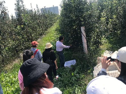 在实地考察了两次之后,队伍被告知合作社因行程问题暂时不能为团队提供考察机会,于是小队成员们转而加入了另一支田园使者队伍的活动当中。因此,而后的两次活动中,队员们都跟随其他队伍来到了杨凌区汇承苹果园。不同于主要经营范围在小麦、玉米收割和播种以及农机研究试验等工作的飞虎农机服务专业合作社,汇承果业技术开发有限公司主要负责以苹果为主的种植与销售,同时也会研发以苹果为主的高科技经济作物的新品种以及对于绿化苗木的销售和推广。大家来到苹果园时,果园的苹果已经处于可摘取状态,于是同学们在果农的带领下学习如何摘取苹果,从铺放杂草到摆放苹果,同学们的动作越来越熟练,而装满苹果的箱子也逐渐增加。每个人都在满怀喜悦地摘苹果,也在摘苹果的同时互相交流经验,互相鼓励。