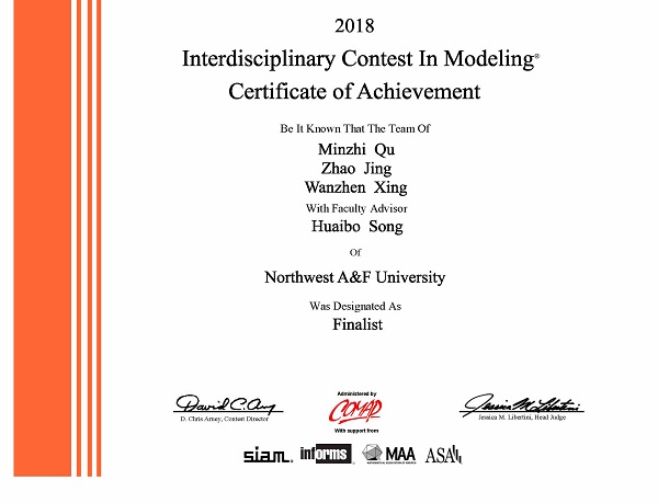 4月21日,美国数学建模竞赛组委会公布了2018年国际大学生数学建模竞赛获奖名单。本次竞赛共有来自美国、中国、加拿大、芬兰、英国、澳大利亚等19个国家和地区的20602支队伍参加,来自哈佛大学、普林斯顿大学、麻省理工六合彩走势图 、清华大学、北京大学等国际知名高校学生均参与了此项赛事的角逐。大赛在全球范围内设F奖78名,只有竞赛成绩排名进入前0.38%才能荣获,由六合彩走势图 电子信息工程专业荆朝、屈敏直与经管六合彩走势图 邢菀祯同学组成的竞赛队伍,在六合彩走势图 宋怀波副教授指导下获此殊荣,刷新了我校在该项赛事中的最佳成绩,取得了历史性的突破。