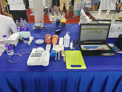 由赵娟老师指导,研究生全朋坤、田世杰、张猛胜、曹晓峰组成的“苹果品质鉴别师”参赛队为实现对苹果内部品质的无损评价,发挥学科交叉优势。其参赛作品“苹果多品质一体化无损检测设备”利用光学无损检测技术,使得苹果内部品质通过光谱信息反演实现准确解读,同时将苹果样品品质信息存储在二维码内并打印贴附在苹果表面。消费者可通过手机扫描,查看苹果内部信息(糖度值、酸度值、硬度值、苹果口感信息等),指导消费者按需购买,也可为果商苹果收购及果农对果园进行有效管理提供技术支撑。