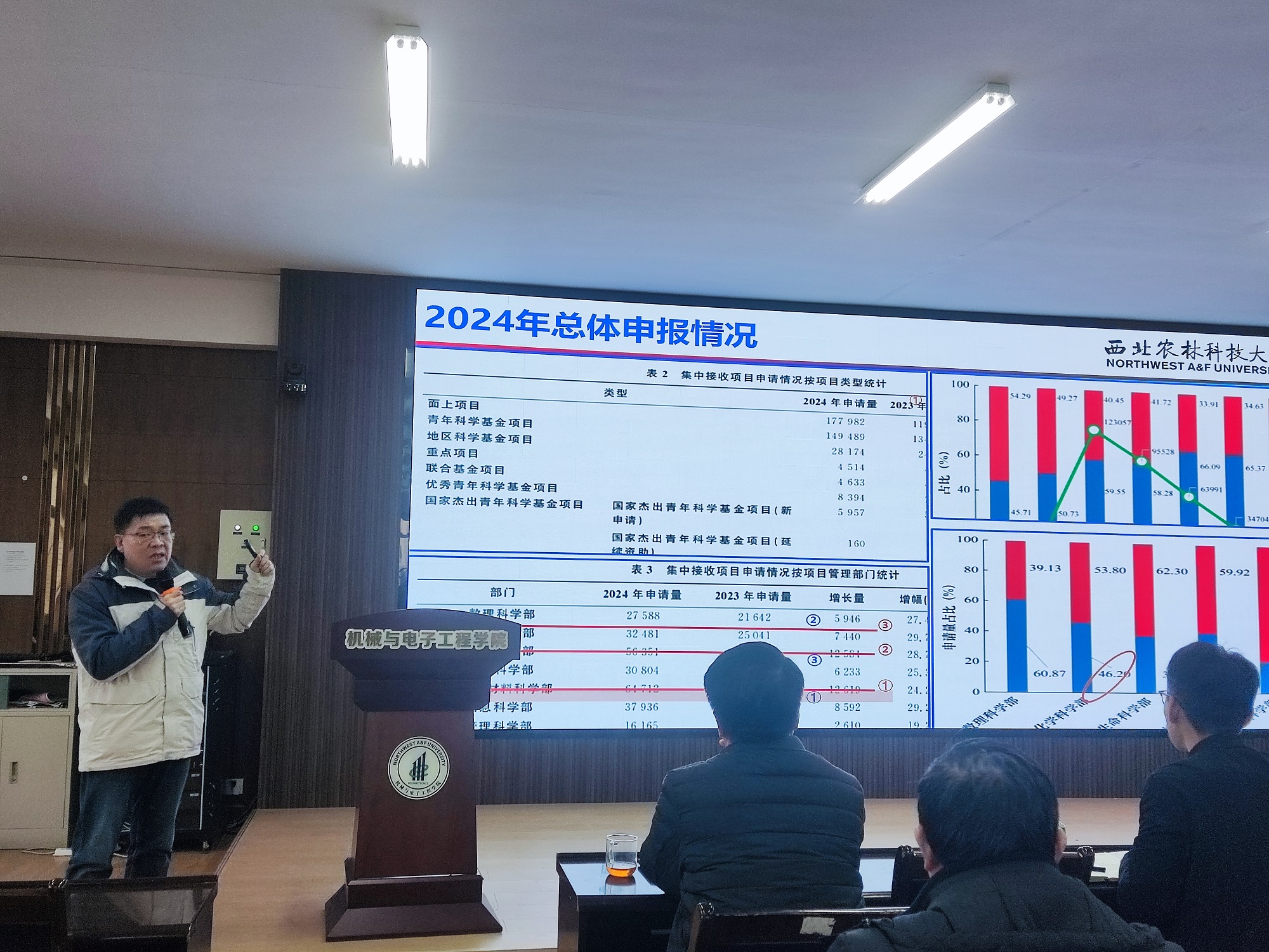 会上,科研秘书奚海莲做了六合彩走势图 2020-2024年国家自然科学基金申请分析报告,从项目申报整体情况、申请与获批人员结构情况、各个系申报情况、六合彩走势图 55周岁以下科教人员在研基金情况以及六合彩走势图 国家自然科学基金工作中存在的问题等几个方面用数据进行了详实的情况分析。