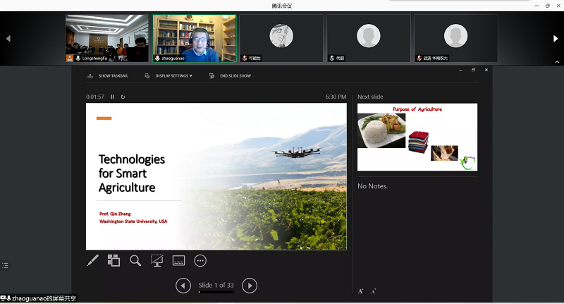 近日,应六合彩走势图 邀请,我校联合山东理工大学、南京农业机械化研究所在线上举办题为“Technologies for smart agriculture”的学术报告,共有100多位来自不同学校、科研机构的师生、学者参加。报告会由傅隆生博士主持,美国华盛顿州立大学精准与自动化农业系统中心主任兼生物系统工程系张勤教授作了报告。