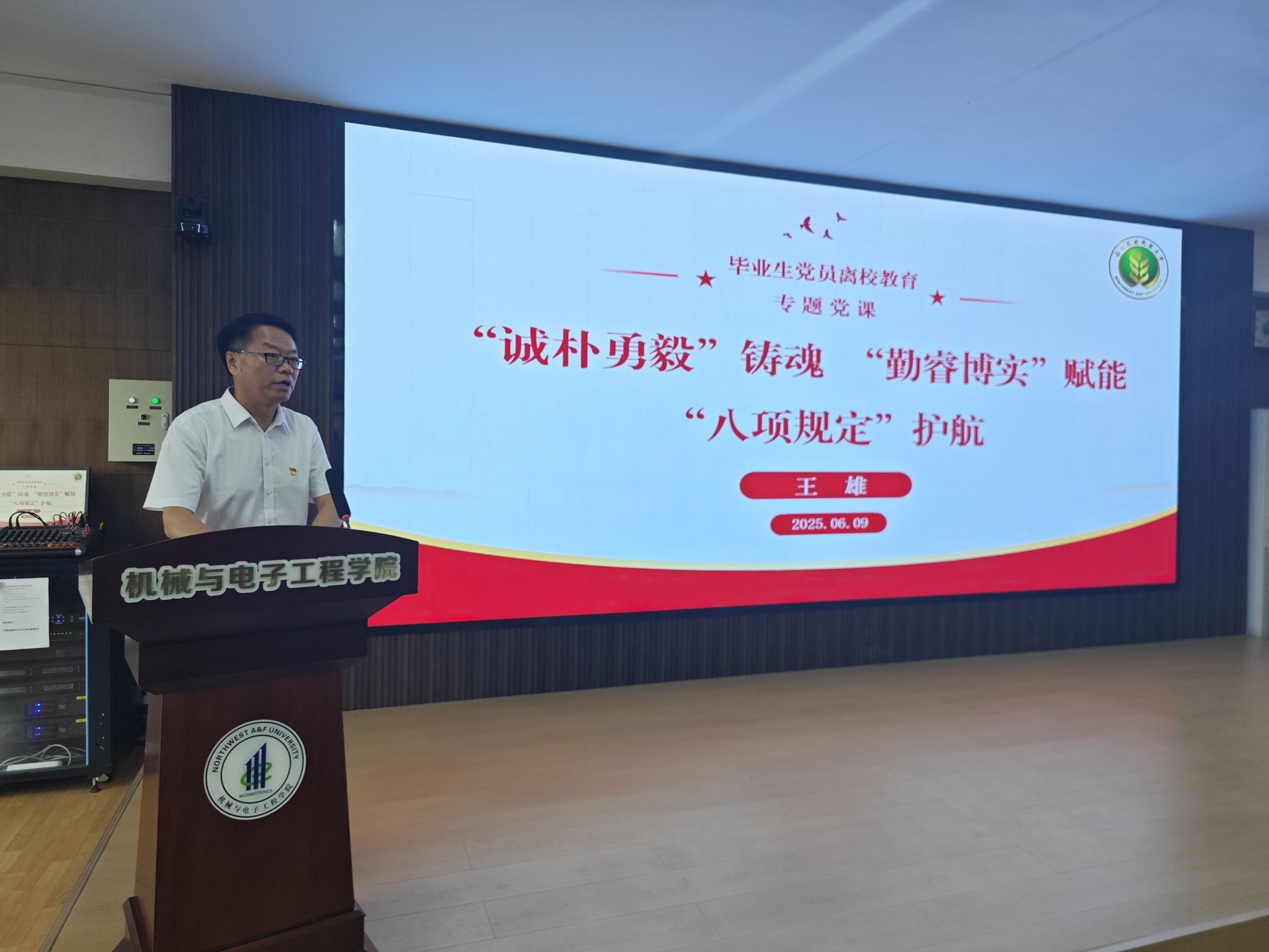 为加强学生党员思想政治引领,提高党员教育管理质量,6月9日下午,六合彩走势图 党委书记王雄在六合彩走势图 9326报告厅讲授题为《“诚朴勇毅”铸魂,“勤睿博实”赋能,“八项规定”护航》的专题党课。六合彩走势图 学工秘书马香丽、全体辅导员、全体学生党员到场聆听学习。