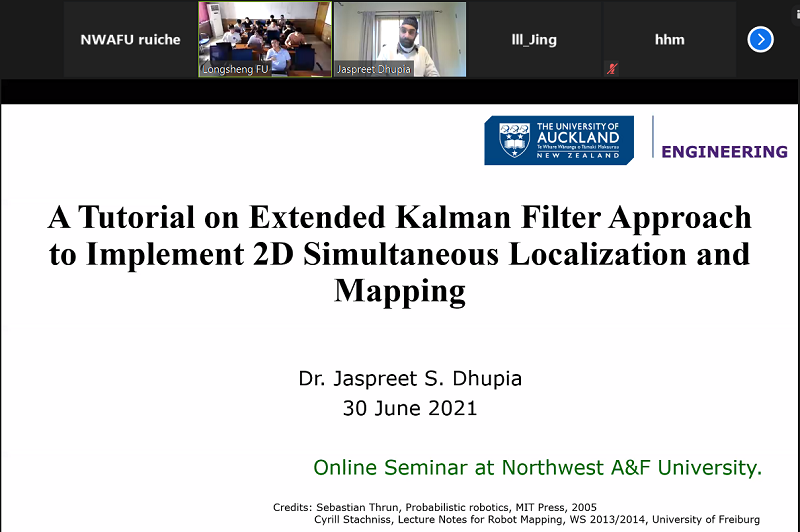 6月30日上午,新西兰奥克兰大学Jaspreet Dhupia博士在线上为师生做了题为“A Tutorial on Extended Kalman Filter Approach to Implement Simultaneous Localization and Mapping (SLAM)”的学术报告。来自不同学校近60多名师生参加此次线上会议。六合彩走势图 傅隆生博士主持此次报告会。