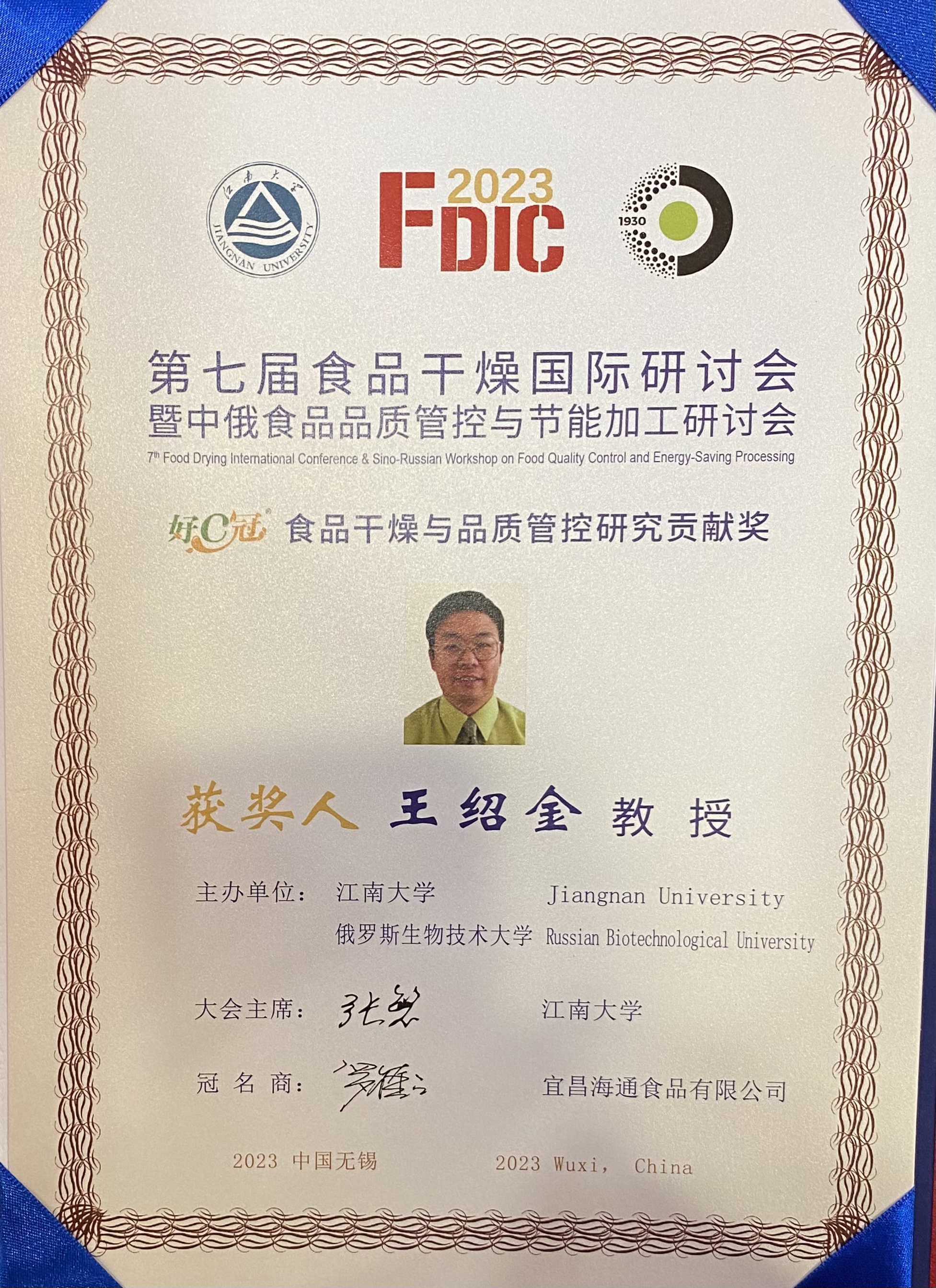 王绍金教授荣获食品干燥与品质管控研究贡献奖