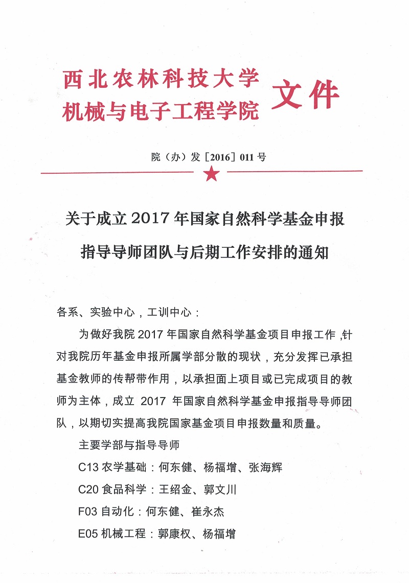 院(办)发[2016]011号关于成立2017年国家自然科学基金申报指导导师团队与后期工作安排的通知